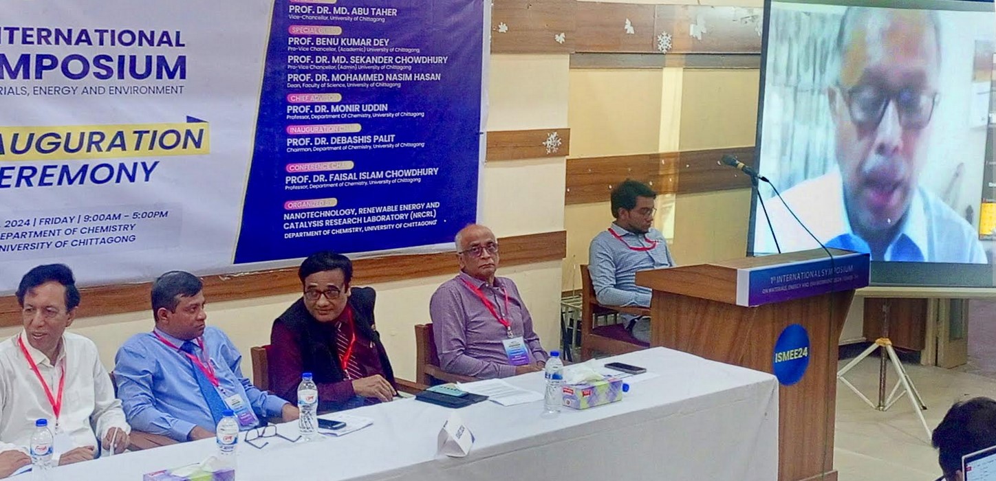 ন্যানোটেকনোলজি, রিনিউয়েবল এনার্জি ও ক্যাটালাইসিস রিসার্চ ল্যাবরেটরির (এনআরসিআরএল) আয়োজনে চট্টগ্রাম বিশ^বিদ্যালয় রসায়ন বিভাগে ২-৩ মে ২০২৪ দু’দিনব্যাপি মেটেরিয়ালস, এনার্জিং এন্ড এনভাইরনমেন্ট বিষয়ক প্রথম আন্তর্জাতিক সিম্পোজিয়াম অনুষ্ঠিত হয়েছে। এ উপলক্ষ্যে ৩ মে ২০২৪ সকাল ৯:৩০ টায় চবি বিজ্ঞান অনুষদের গ্যালারিতে অনুষ্ঠিত উদ্বোধনী সেশনে প্রধান অতিথি হিসেবে ভার্চুয়ালি বক্তব্য রাখেন চট্টগ্রাম বিশ^বিদ্যালয়ের মাননীয় উপাচার্য প্রফেসর ড. মোঃ আবু তাহের। অনুষ্ঠানে বিশেষ অতিথি হিসেবে উপস্থিত থেকে বক্তব্য রাখেন চবি মাননীয় উপ-উপাচার্য (একাডেমিক) প্রফেসর বেনু কুমার দে ও চবি বিজ্ঞান অনুষদের ডিন প্রফেসর ড. মোহাম্মদ নাসিম হাসান। চবি রসায়ন বিভাগের সভাপতি প্রফেসর ড. দেবাশিস পালিতের সভাপতিত্বে অনুষ্ঠিত উদ্বোধনী সেশনে স্বাগত বক্তব্য রাখেন কনফারেন্স চেয়ার চবি রসায়ন বিভাগের প্রফেসর ড. ফয়সল ইসলাম চৌধুরী। এছাড়াও অন্যান্যদের মধ্যে বক্তব্য রাখেন সম্মেলনের প্রধান উপদেষ্টা চবি রসায়ন বিভাগের প্রফেসর ড. মনির উদ্দিন ও বিএনও এর ম্যানেজিং ডাইরেক্টর মোহাম্মদ ইউসুফ। অনুষ্ঠান সঞ্চালনা করেন চবি রসায়ন বিভাগের প্রভাষক অভিজিৎ চক্রবর্তী।