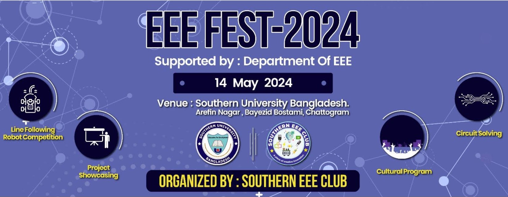 সাউদার্ন ইউনিভার্সিটি বাংলাদেশ এর ইলেকট্রিক্যাল অ্যান্ড ইলেকট্রনিক ইঞ্জিনিয়ারিং বিভাগ ও “সাউদার্ন ইইই ক্লাব” এর উদ্যোগে আগামীকাল ১৪ মে, ২০২৪ ইং মঙ্গলবার বিশ^বিদ্যালযের স্থায়ী ক্যাম্পাস আরেফিন নগরে ইইই ফেস্ট—২০২৪ অনুষ্ঠিত হবে। এই আয়োজনে রোবট প্রতিযোগিতা, প্রজেক্ট প্রদর্শনী ও সার্কিট সলভিং সহ বিভিন্ন ইভেন্টে আহসানউল্লাহ ইউনিভার্সিটি অব সায়েন্স এন্ড টেকনোলজি, প্রাইম এশিয়া ইউনিভার্সিটি, ফেনী ইউনিভার্সিটি, আন্তর্জাতিক ইসলামি বিশ্ববিদ্যালয় চট্টগ্রাম, পোর্ট সিটি ইন্টারন্যাশনাল ইউনিভার্সিটি, প্রিমিয়ার ইউনিভার্সিটি, চট্টগ্রাম ইন্ডিপেন্ডেন্ট ইউনিভার্সিটি, ইসাইন, মেগামাইন্ড অটোমেশন, ফরিদপুর পলিটেকনিক এবং শ্যামলী আইডিয়াল পলিটেকনিকসহ প্রায় অর্ধ—শতাধিক অংশগ্রহণকারী তাদের নিজ নিজ টিমের প্রতিনিধিত্ব করবেন।