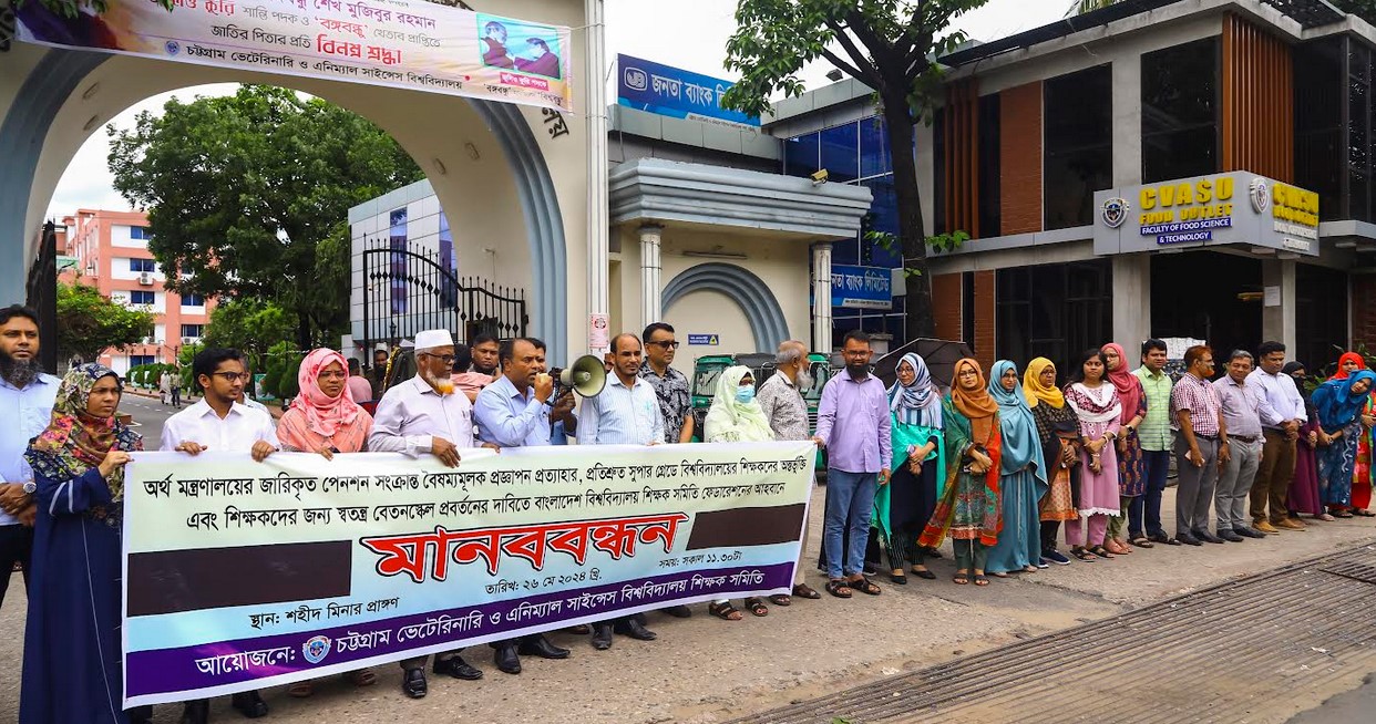 অর্থ মন্ত্রণালয়ের জারিকৃত পেনশন সংক্রান্ত বৈষম্যমূলক প্রজ্ঞাপন প্রত্যাহারসহ বিভিন্ন দাবিতে মানববন্ধন কর্মসূচি পালন করেছে চট্টগ্রাম ভেটেরিনারি ও এনিম্যাল সাইন্সেস বিশ^বিদ্যালয় (সিভাসু) শিক্ষক সমিতি।