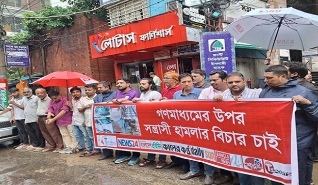 বক্তারা বলেন, গত ৫ আগস্ট ছাত্র-জনতার গণঅভ্যুত্থানের পর ছাত্র-জনতার আন্দোলনকে প্রশ্নবিদ্ধ করতে দুর্বৃত্তরা সোমবার দেশের শীর্ষস্থানীয় মিডিয়া হাউজ ইস্ট ওয়েস্ট মিডিয়া গ্রুপ পিএলসি কমপ্লেক্সে হামলার দুঃসাহস দেখিয়েছে। আমরা এই হামলার তীব্র নিন্দা ও প্রতিবাদ জানাই।