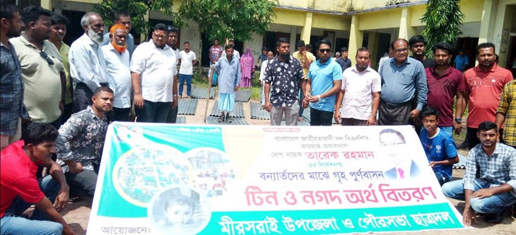 বন্যা পরবর্তী গৃহ পুর্নবাসনের লক্ষ্যে মিরসরাই উপজেলা এবং পৌরসভা ছাত্রদলের উদ্যোগে উপজেলার বিভিন্ন ইউনিয়নের ক্ষতিগ্রস্থ ২৪ টি পরিবারকে ২ বান করে টিন ও নগদ অর্থ সহায়তা প্রদান করা হয়েছে।