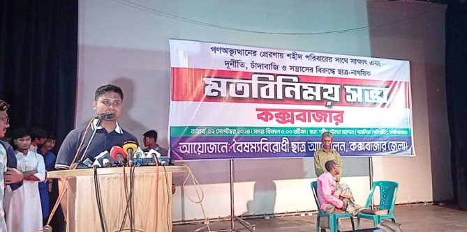 আজ বৃহস্পতিবার (১২ সেপ্টেম্বর) বিকেল ৫টায় কক্সবাজারে ‘গণঅভ্যুত্থানের প্রেরণায় শহীদ পরিবারের সঙ্গে সাক্ষাৎ এবং দুর্নীতি, চাঁদাবাজি ও সন্ত্রাসের বিরুদ্ধে ছাত্র-নাগরিক মতবিনিময় সভায় তিনি এ কথা বলেন।