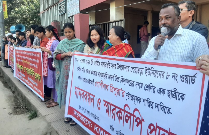 খাগড়াছড়ি আদর্শ উচ্চ বিদ্যালয়ের দশম শ্রেণির ছাত্রীকে ধর্ষণ ও হত্যার চেষ্টাকারী গোপীনাথ ত্রিপুরার দৃষ্টান্তমূলক শাস্তির দাবিতে মানববন্ধন করেছেন।