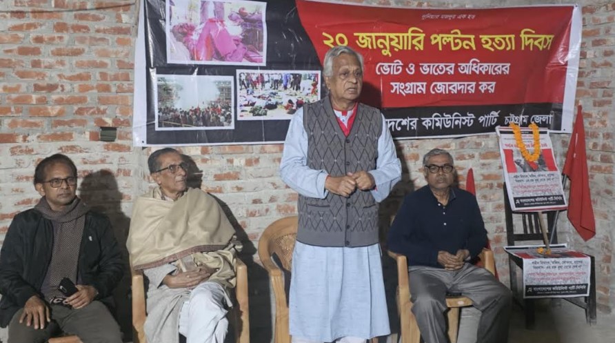 সোমবার (২০ জানুয়ারী) সন্ধ্যা ৬ টায়, চট্টগ্রামের হাজারীগলিস্থ সিপিবি কার্যালয়ে ২৪ তম পল্টন হত্যার স্বরণ সভায় সভাপ্রতিত্ব করেন সিপিবি চট্টগ্রাম জেলা কমিটি সভাপতি কমরেড অশোক সাহা, সঞ্চালনা করেন জেলা কমিটির সহকারী সম্পাদক কমরেড নূরুচ্ছাফা ভূঁইয়া। উক্ত সভায় বক্তব্য রাখেন সিপিবির কেন্দ্রীয় কমিটি সভাপতি বীর মুক্তিযোদ্ধা কমরেড মোঃ শাহ আলম, সিপিবি কেন্দ্রীয় কমিটির সদস্য কমরেড মৃনাল চৌধুরী, জেলা সম্পাদক মন্ডীর সদস্য বীর মুক্তিযোদ্ধা কমরেড উত্তম চৌধুরী, কমরেড ফরিদুল ইসলাম, কমরেড রেখা চৌধুরী ও ছাত্র নেতা সুদীপ্ত চাকমা প্রমুখ।