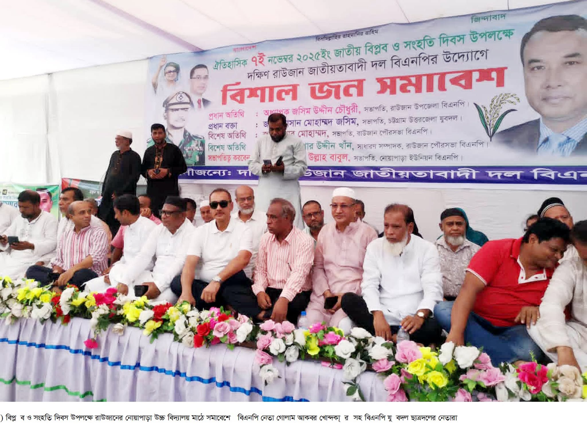 জনসভায় বক্তব্য রাখেন সর্বজনাব রাউজান উপজেলা বিএনপির বিএনপি নেতা নাসিম উদ্দিন চৌধুরী, উত্তর জেলা যুবদলের যুগ্ম সাধারণ সম্পাদক এইচ এম নুরুল হুদা, জিএম মোরশেদ, মুরাদুল আলম, জসীম উদ্দীন, সেলিম নূর, এডভোকেট রফিকুল আলম, এডভোকেট আবু সাঈদ, দিদারুল ইসলাম, মোহাম্মদ ইদ্রিস, মোহাম্মদ রফিক, জিয়াউদ্দিন হায়দার কমলেন্দুশীল, সিরাজ মেম্বার, এমদাদুল হক, সিরাজউদ্দৌল্লাহ চেয়ারম্যান, রহিম উদ্দিন ওয়াসিম, আব্দুল মান্নান, আবু তাহের সওদাগর, দিদারুল আলম, আফসারুজ্জামান, মোঃ ফারুক, মাহাবুল আলম, আনোয়ার হোসেন, মাহাবুবুল আলম, শেখ জাহাঙ্গীর, সেলিম উদ্দিন, পিয়ার মোহাম্মদ বাবু, নাঈম উদ্দিন মিনহাজ, মাসুদ পারভেজ রনি, মুরাদুর রহমান, ফোরকান সিকদার প্রমূখ। অপরদিকে গতকাল ৭ নভেম্বর শুক্রবার বিকালে রাউজান কলেজ মাঠে সমাবেশ করেন বিএনপির কেন্দ্রীয় কমিটির সাবেক ভাইস চেয়ারম্যান গিয়াস উদ্দিন কাদের চৌধুরী সমাাবেশে তার বক্তব্যে বলেন,যতক্ষণ পর্যন্ত আমার শরীরে রক্ত থাকবে, ততদিন আমি নির্বাচন করবো । বিএনপির শীর্ষ নেতাদের উদ্দেশ্যে বক্তব্য রেখে স্থগিত হওয়া বিএনপির কেন্দ্রীয় কমিটির ভাইস চেয়ারম্যান ও সাবেক সংসদ সদস্য আলহাজ্ব গিয়াস উদ্দিন কাদের চৌধুরী বলেছেন,আমার রক্তের সঙ্গে রাউজানের মানুষের রক্ত মিশে আছে। যতক্ষণ পর্যন্ত আমার শরীরে রক্ত থাকবে, ততদিন আমি নির্বাচন করবো এবং আমি নির্বাচন করবোই ইনশাআল্লাহ ।৭ নভেম্বর জাতীয় বিপ্লব ও সংহতি দিবস উপলক্ষে প্রধান অতিথির বক্তব্যে বিএনপিনেতা গিয়াস উদ্দিন কাদের চৌধুরী আরো বলেন, “আমি বাবা হারিয়েছি জেলখানায়, ভাই হারিয়েছি জেলখানায়। হয়তো আমার মৃত্যুও হতো জেলখানায়। কিন্তু মানুষের ভালোবাসাই আমাকে টিকিয়ে রেখেছে। আওয়ামী লীগ সরকারকে স্বৈরাচারী উল্লেখ করে তিনি বলেন, “স্বৈরাচারী সরকারের আমলে মসজিদের ইমাম ও পুরোহিত পর্যন্ত কথা বলতে পারেনি।”মাদক কারবারীদের প্রতিহত করার আহ্বান জানিয়ে গিয়াস উদ্দিন কাদের চৌধুরী আরও বলেন, “মাদক ব্যবসায়ীরা পুলিশকে টাকা দিয়ে ব্যবসা করে। পুলিশ যেন ব্যবসায়ী না হয় ।এটাই আমার আহ্বান।”রাউজান উপজেলা বিএনপির আহ্বায়ক নুরুল হুদার সভাপতিত্বে ও যুগ্ম আহ্বায়ক ফিরোজ আহমদের সঞ্চালনায় অনুষ্ঠিত এ জনসভায় আরও বক্তব্য রাখেন সাবেক জেলা বিএনপির সদস্য আবু জাফর চৌধুরী, পৌর বিএনপির সাবেক সাধারণ সম্পাদক সৈয়দ মঞ্জুরুল হক, বিএনপি নেতা হাবিবুল্লাহ মাষ্টার, সাবেক পৌর কাউন্সিলর রেজাউল রহিম আজম, বিএনপি নেতা ফয়েজুল ইসলাম চৌধুরী টিপু, মুসলেহ উদ্দিন, উত্তর জেলা যুবদলের সহসভাপতি সাবের সুলতান কাজল, সেলিম উদ্দিন, ইউছুপ তালুকদার, একরাম মিয়া, শাহজাহান শাহিল, শাহাদাত মির্জা, তছলিম উদ্দিন, সাইফুল আজম ছোটন, মোহাম্মদ আলী সু