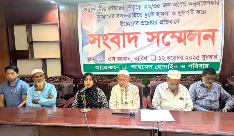 গত ৮ নভেম্বর সকাল ০৯ ঘটিকায় চট্টগ্রামস্থ গরীবুল্লাহ হাউজিং সোসাইটি ঢেবারপাড় তেল কোম্পানীর বাড়িতে সন্ত্রাসী মীর জহিরের নেতৃত্বে ৩০/৩৫ জন অবৈধ অনুপ্রবেশকারী বসতবাড়িতে ঢুকে হামলা ও লুটপাট করে উচ্ছেদের চেষ্ঠা এবং প্রাণ নাশের হুমকির প্রতিবাদে বুধবার (১২ নভেম্বর) বিকাল ৩ ঘটিকায় তেল কোম্পানীর বাড়ির মালিক আহমেদ হোসেন ও তার পরিবারের পক্ষ থেকে চট্টগ্রাম প্রেসক্লাব এস রহমান হলে এক সংবাদ সম্মেলন অনুষ্ঠিত হয়।