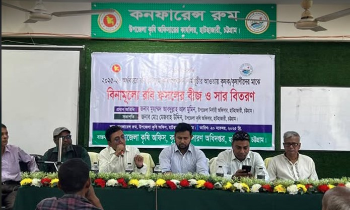 শফিউল আলম, রাউজানঃ হাটহাজারী উপজেলায় রবি মৌসুমে কৃষি প্রণোদনা কর্মসূচীর আওতায় ৭২০ জন কৃষকের মাঝে বিনামূল্যে রবি ফসলের বীজ ও সার বিতরণ করা হয়। এ কর্মসূচীর আওতায় গম, সরিষা, চিনাবাদাম, সূর্যমুখী, মুগ, খেসারি, অড়হড় ও ফেলনের বীজ ও প্রয়োজনীয় সার বিতরণ করা হয়।