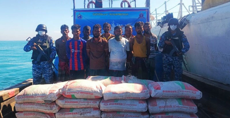 এসময় সন্দেহজনক ১টি ফিশিং ট্রলার তল্লাশি চালিয়ে অবৈধভাবে শুল্ক-কর ফাঁকি দিয়ে মাদকের বিনিময়ে মিয়ানমারে পাচারের উদ্দেশে বহন করা প্রায় ২ লাখ ৪৭ হাজার টাকা মূল্যের ৪৫০ বস্তা সিমেন্টসহ ৯ জন পাচারকারীকে আটক করা হয়।