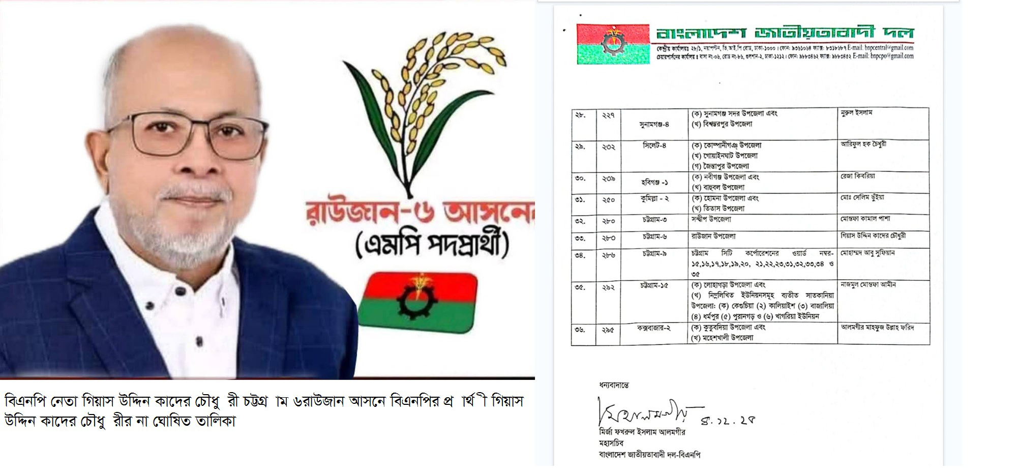 (৪ ডিসেম্বর) বৃহস্পতিবার বিএনপির মহাসচিব মির্জা ফখরুল ইসলাম আলমগীর চট্টগ্রাম-৬ (রাউজান) আসনে বিএনপির প্রার্থী হিসাবে গিয়াস উদ্দিন কাদের চৌধুরীর না মঞোষনা করেন ।
