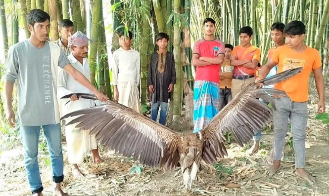 স্থানীয় জাহাঙ্গীর রহমান জানান, তিনি প্রথম বাঁশঝাড়ে শকুনটিকে দেখতে পান। দুর্বলতার কারণে উড়তে না পারায় কাছে গিয়ে সহজেই সেটিকে ধরতে সক্ষম হন। পরে পাখিটিকে নিরাপদ স্থানে নিয়ে রাখা হয়।