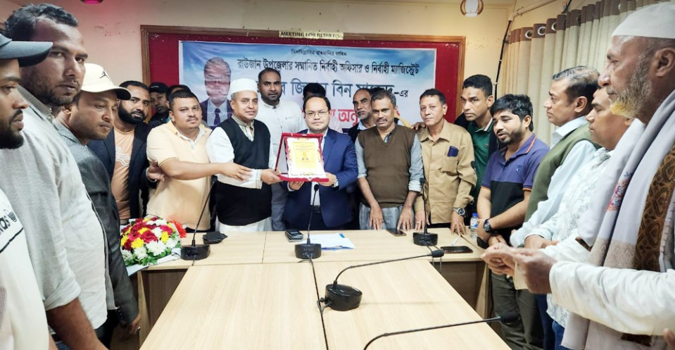 শফিউল আলম, রাউজান ঃ রাউজান উপজেলা নির্বাহী কর্মকর্তা জিসান বিন মাজেদ এর বদলি জনিত বিদায় উপলক্ষে তাকে বিদায় সংবর্ধনা দিয়েছে রাউজান পৌর এলাকাবাসী।