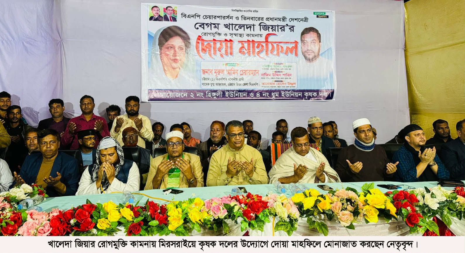 হিঙ্গুলী ইউনিয়ন কৃষক দলের আহ্বায়ক সাইফুল ইসলাম ফারুকের সভাপতিত্বে ও ধুম ইউনিয়ন বিএনপির আহ্বায়ক আমান উল্লার সঞ্চালনায় দোয়া মাহফিলে প্রধান বক্তা ছিলেন চট্টগ্রাম উত্তর জেলা কৃষকদলের আহ্বায়ক বদিউল আলম বদরুল।