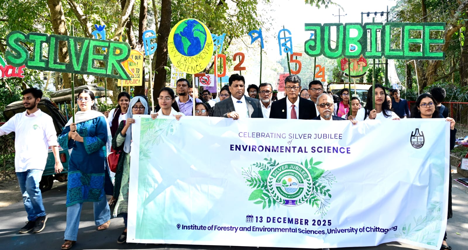 চট্টগ্রাম বিশ্ববিদ্যালয়ের ইনস্টিটিউট অব ফরেস্ট্রি এন্ড এনভায়রনমেন্টাল সায়েন্সেসের উদ্যোগে পরিবেশ বিজ্ঞান বিষয়ের গ্র্যাজুয়েটদের ২৫ বছর পূর্তি উপলক্ষে বৃহস্পতিবার (১১ ডিসেম্বর) সকাল ১১টায় বর্ণাঢ্য এক র‍্যালি অনুষ্ঠিত হয়। র‍্যালিটি চবি শহীদ মিনার থেকে শুরু হয়ে প্রশাসনিক ভবনের সামনে হয়ে ক্যাম্পাসের গুরুত্বপূর্ণ সড়ক প্রদক্ষিণ করে।