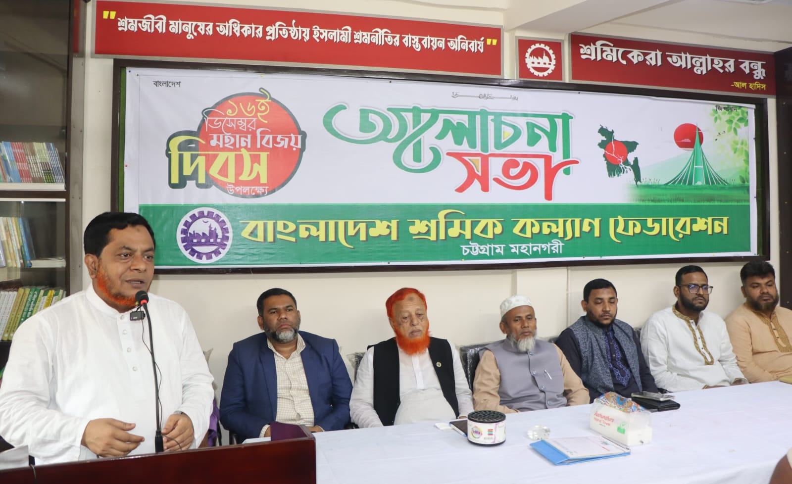 ১৬ ডিসেম্বর (মঙ্গলবার) সকাল ১০ টায় নগরের জামাল খানস্থ কার্যালয়ে মহান বিজয় দিবস উপলক্ষ্যে নগর শ্রমিক কল্যাণ ফেডারেশনের উদ্যোগে আয়োজিত আলোচনা সভায় সভাপতির বক্তব্যে তিনি এসব কথা বলেন। সভাটি সঞ্চালনা করেন ফেডারেশনের নগর সাধারণ সম্পাদক আবু তালেব চৌধুরী। আরো বক্তব্য রাখেন মহানগরীর সহ-সভাপতি মকবুল আহমদ ভূঁইয়া।