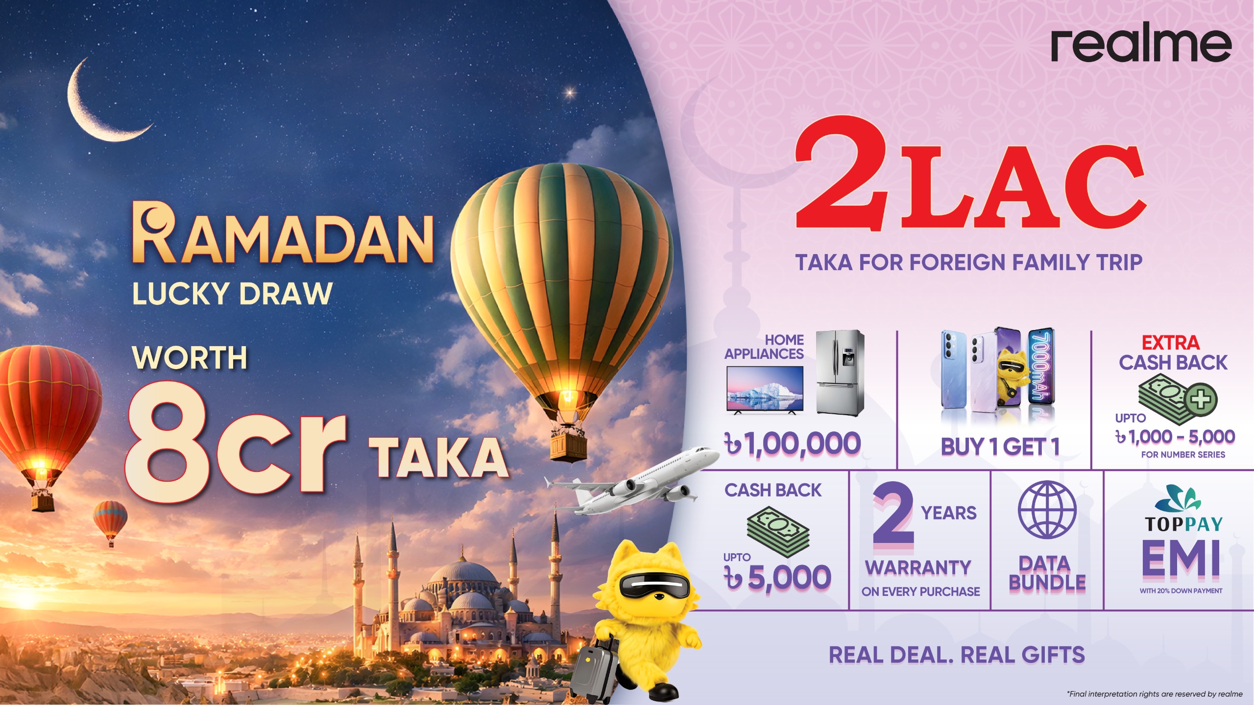 ক্যাম্পেইনের আওতায়, রোববার (০১ মার্চ) থেকে শুরু করে ঈদের আগের দিন পর্যন্ত যেসব ক্রেতা নতুন রিয়েলমি স্মার্টফোন কিনবেন, তারা আকর্ষণীয় পুরস্কারসহ একটি র‍্যাফেল ড্রতে অংশ নেওয়ার সুযোগ পাবেন। প্রথম পুরস্কার হিসেবে বিজয়ী পাবেন ২ লাখ টাকার ফ্যামিলি ট্রাভেল প্যাকেজ, আর দ্বিতীয় পুরস্কার হিসেবে থাকছে ১ লাখ টাকার হোম অ্যাপ্লায়েন্স। নির্বাচিত কিছু মডেলে ভাগ্যবান ক্রেতাদের জন্য থাকছে বিশেষ ‘একটি কিনলে একটি ফ্রি’ (বোগো) অফার। এছাড়াও, অফার চলাকালে সকল ফোনে ৫,০০০ টাকার নিয়মিত ক্যাশব্যাক পাওয়ার সুযোগ থাকছে। পাশাপাশি, নাম্বার সিরিজের নির্বাচিত মডেল, অর্থাৎ রিয়েলমি ১২, ১৪টি, ১৪, ১৫টি, ১৫ ও ১৫প্রো-তে ১,০০০ টাকা থেকে শুরু করে ৫,০০০ টাকা পর্যন্ত অতিরিক্ত ক্যাশব্যাক পাওয়ার সুযোগও থাকছে।