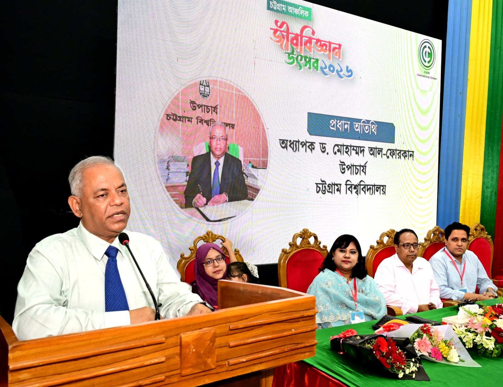 চট্টগ্রাম বিশ্ববিদ্যালয়ের মাননীয় উপাচার্য প্রফেসর ড. মোহাম্মদ আল্-ফোরকান বলেন, বিজ্ঞানে যে জাতি যত উন্নত হবে সে জাতি ততই সমৃদ্ধ হবে। সর্বক্ষেত্রে তাদের উন্নতি ঘটবে। এজন্য কোমলমতি শিক্ষার্থীদের বিজ্ঞান সম্পর্কে উদ্বুদ্ধ করতে হবে। বিজ্ঞানের অন্যতন শাখা হলো জীববিজ্ঞান। শেখার মতো, আবিষ্কার করার মতো জীববিজ্ঞানের অনেক বিষয় রয়েছে। সেসব বিষয়ে শিক্ষার্থীদের জানার চেষ্টা করতে হবে। এজন্য প্রথমে নিজেকে প্রশ্ন করতে হবে, আমি কে? জীবনের পরতে পরতে আমি কে, এ প্রশ্নের উত্তর খোঁজার মাধ্যমে অনেক অজানা বিষয়ে বেরিয়ে আসবে।