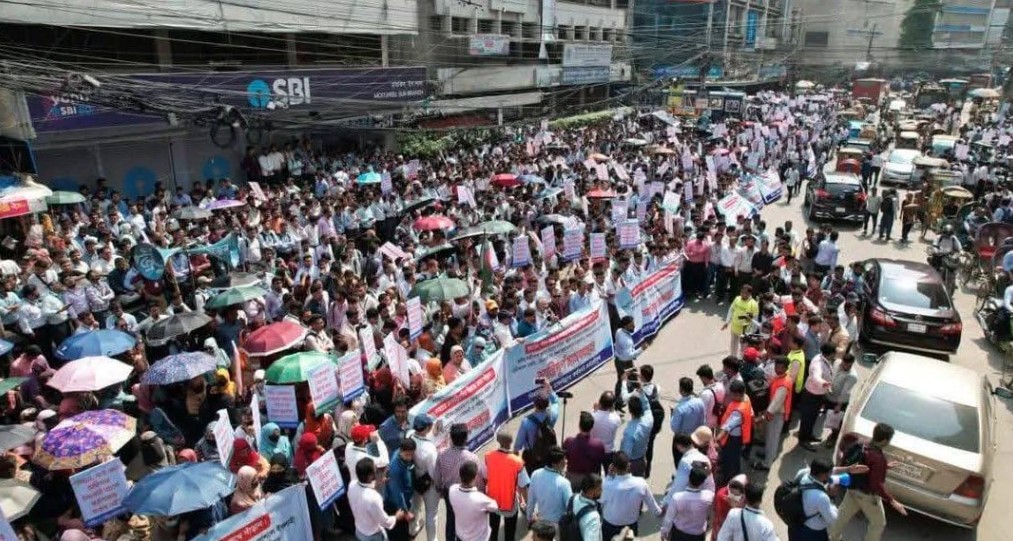 চাকরি পুনর্বহালের দাবিতে চাকরিচ্যুত ব্যাংক কর্মকর্তাদের বিক্ষোভ