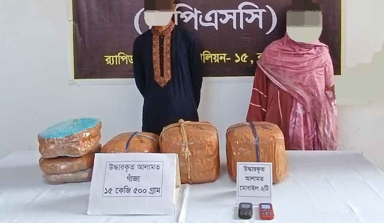 এ সময় ‘এসআই এন্টারপ্রাইজ’ নামের একটি বাসে থাকা দুই যাত্রীর আচরণ সন্দেহজনক মনে হলে তাদের জিজ্ঞাসাবাদ করা হয়। পরে তাদের সঙ্গে থাকা ট্রাভেল ব্যাগ তল্লাশি করে ১৫ কেজি ৫০০ গ্রাম গাঁজা জব্দ করা হয়।