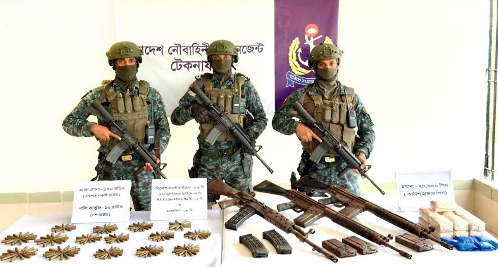 টেকনাফে নৌবাহিনীর অভিযানে অস্ত্র, গোলাবারুদ ও বিপুল ইয়াবা জব্দ